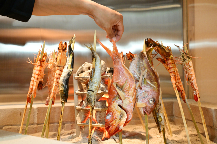 囲炉裏を囲む完全個室で、多彩な食材の原始焼きとお酒が楽しめる店
